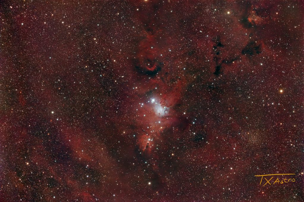 NGC 2264 is about 2,350 light years away plus or minute half a century. It’s located in the constellation Monoceros (the Unicorn) which is just east of Orion between Canis Major and Canis Minor. At the bottom center is the feature the nebula is named for, a dark conical structure that is the southern end of the star forming region bordered by the bright start at the top center of the image. Solar radiation from these hot, young stars energizes the gases around them. As that energy is released it is emitted as light in very specific frequencies that inform us as to the make up of these gasses. The vast majority of the gas we see is hydrogen, which emits a dark red light visible to humans, if we could detect color at such low intensity levels. While we can’t detect that color, cameras can. Particularly if you hold the shutter open for hours at a time, or add up a bunch of shorter images (79 frames of 5 minutes each in this case) to accumulate hours worth of photon collection.